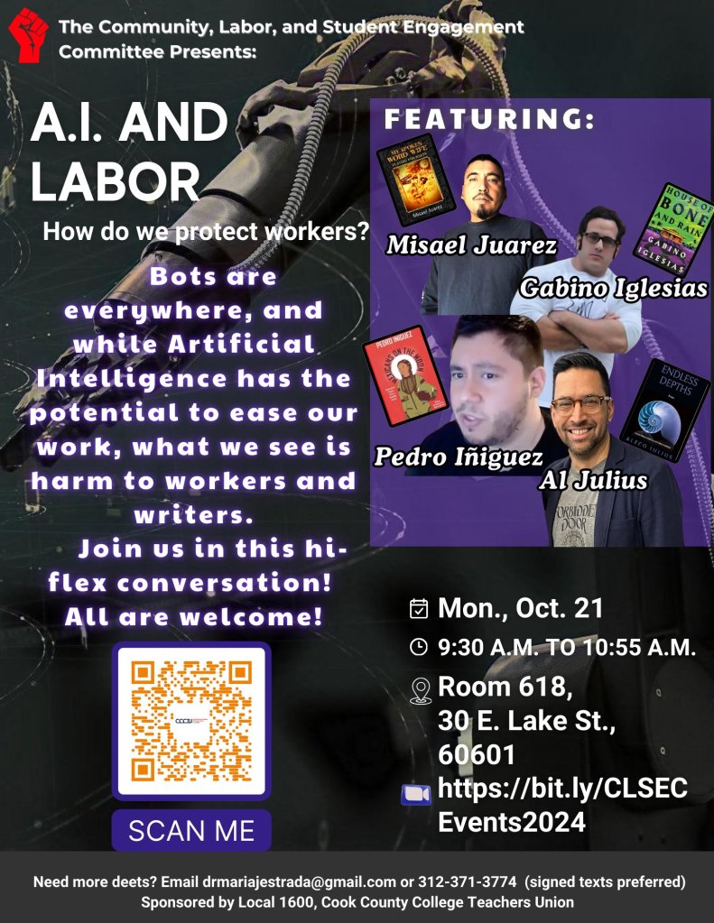 -I spoke to students at Harold Washington College on two occasions; 1) The Summer Scares event where I read my work and answered student questions; 2) I spoke on AI and its negative effect on the creative industry.