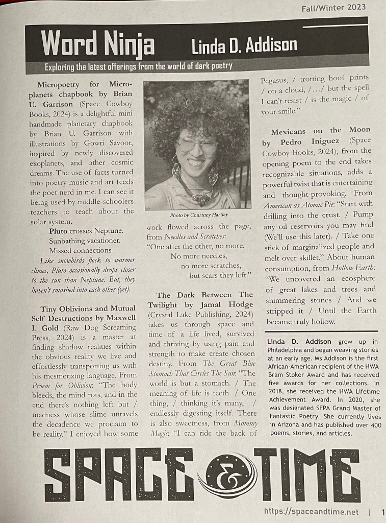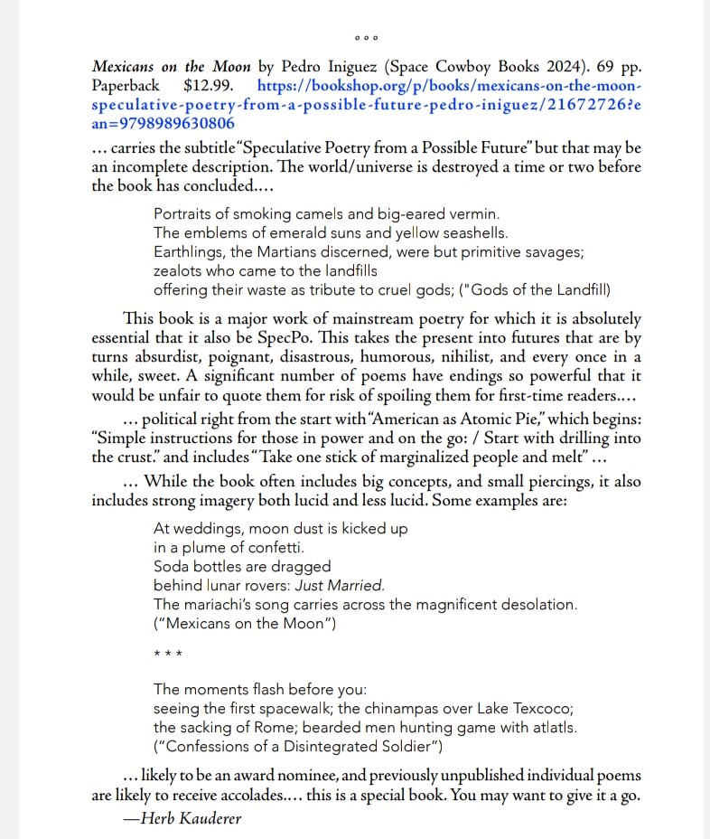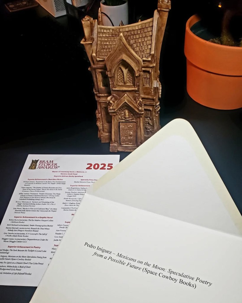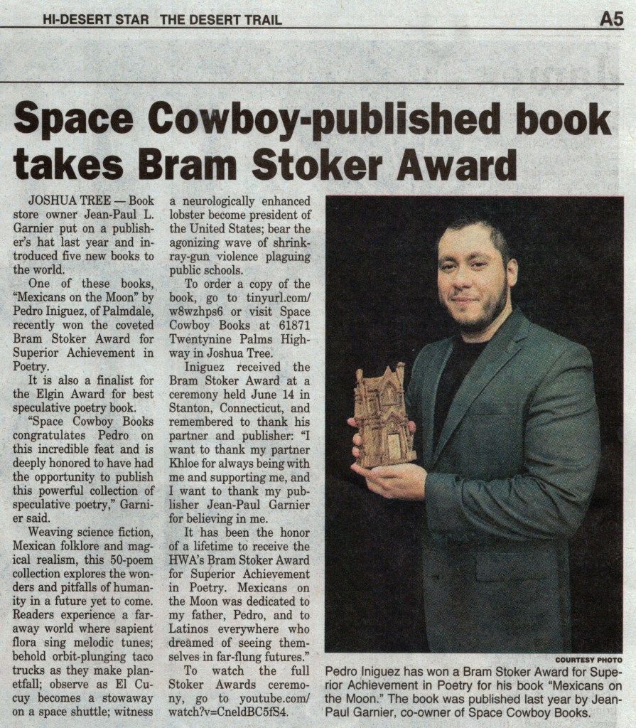 -I won the HWA’s 2024 Bram Stoker Award for Superior Achievement in Poetry for my collection Mexicans on the Moon: Speculative Poetry from a Possible Future. I became the first person of Mexican descent to win the Stoker Award. My win was featured in the Hi-Desert Star newspaper.