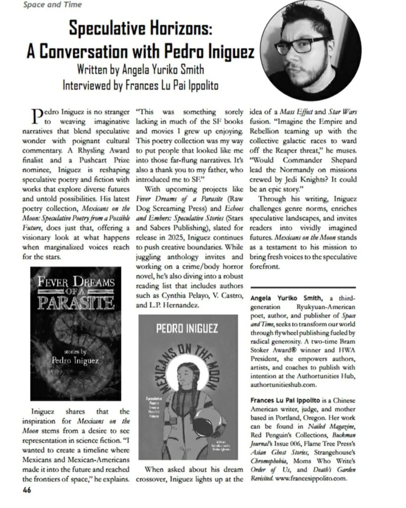 -I was interviewed or spotlighted at several places, including NPR’s The Show (KJZZ), UCSD’s Extension Program with KC Grifant, the Horror in the Margins Podcast, HOWL Society, Space and Time Magazine, HWA’s Seers’ Table, Ginger Nuts of Horror, The Paranormal Xperience, Frivolous Comma’s Latine Roundtable, Canvas Rebel, The Comma, Shortwave’s Your Favorite Author’s Favorite Author, The Butchered Writers, The Fandomentals, Why I Love Horror, and Café con Kaitlyn, among others.