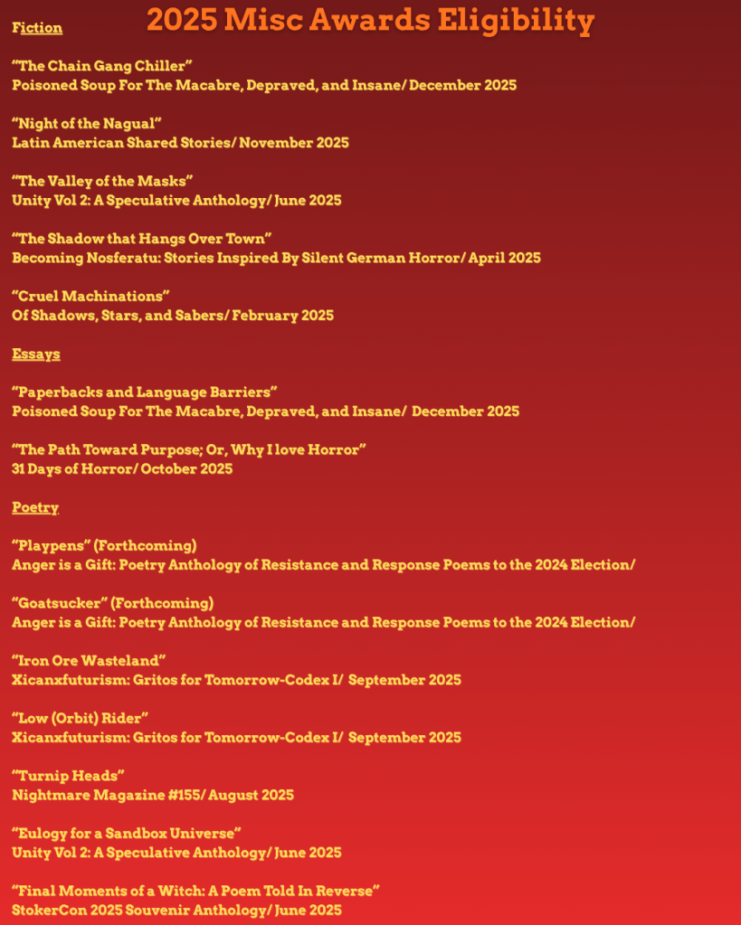 Today my flash drive got wiped out, deleting all my work, including the current novel I was outlining. So I decided to get in on #AwardEligibility time. This is my first time doing this, so I’ll be including fiction and poetry published this year (2022) on a single thread. If you’d like an electronic copy of any of the works listed below, feel free to contact me here. Feel free to RT and recommend any of these works if you’d like.