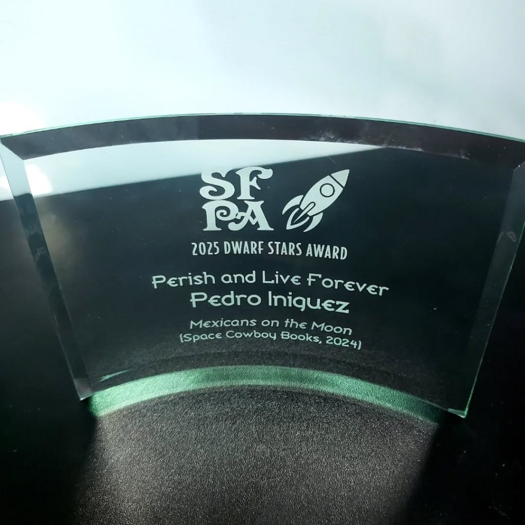 I finally received my awards from the SFPA: The Elgin Award for Best Full-length Poetry Collection (Mexicans on the Moon) and the Dwarf Star Award (Perish and Live Forever). Many thanks to my publisher Space Cowboy Books, and to everyone who voted or has supported my work. It is the honor of a lifetime. Much love!